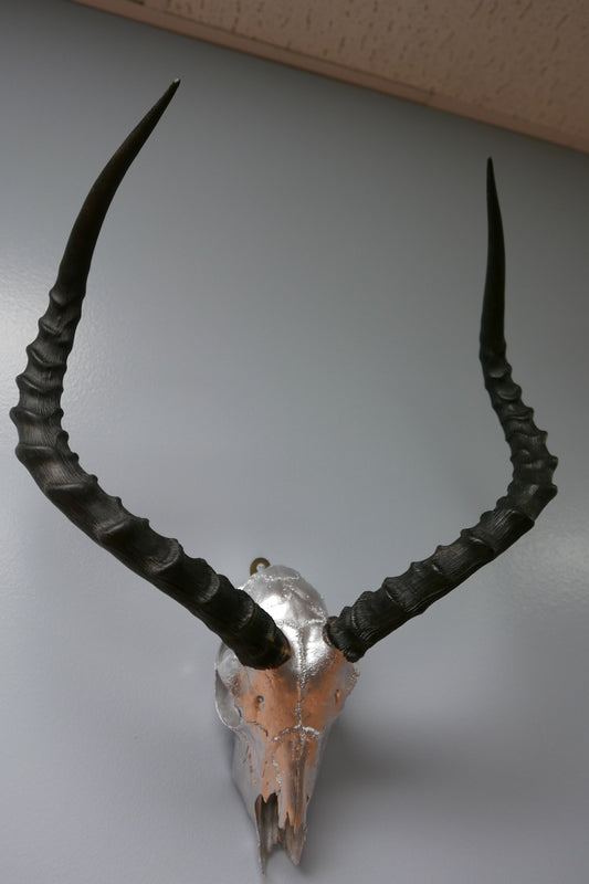 Impala is an amazing African antelope. This skull has been spray painted a beautiful silver color, and has been completely cleaned, boiled, disinfected, oiled and then a metal bracket was installed on the back for easy wall hanging. We ship the skull detached from...- $167.00