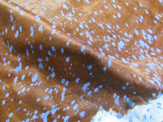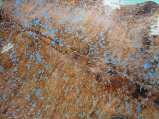Voici un superbe tapis en peau de vache délavé à l'acide d'un bleu éclatant. Une peau marron naturelle avec un ventre blanc et des taches bleues délavées à l'acide partout. Magnifique !- $299.00