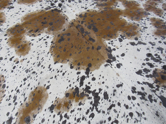 Tapis en cuir de vachette à pois bruns et blancs avec effet vieilli - Taille : 8x7 1/4 pieds O-1014