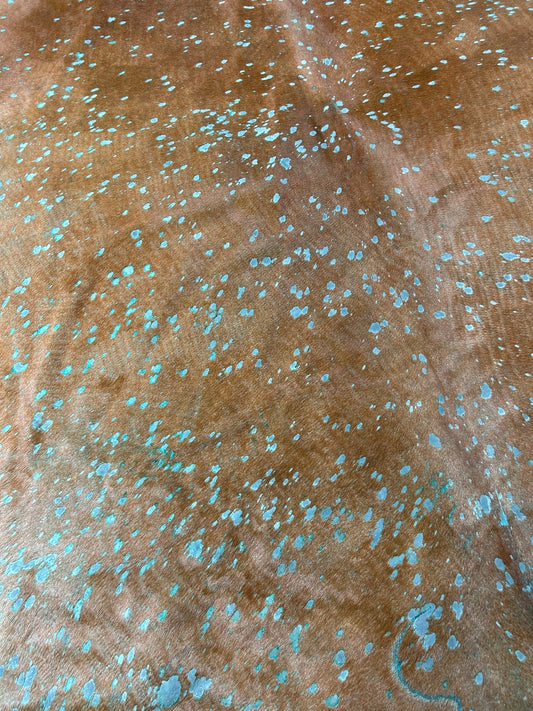 Tapis en peau de vache marron délavé à l'acide turquoise - Dimensions : 8x7 pieds C-1674