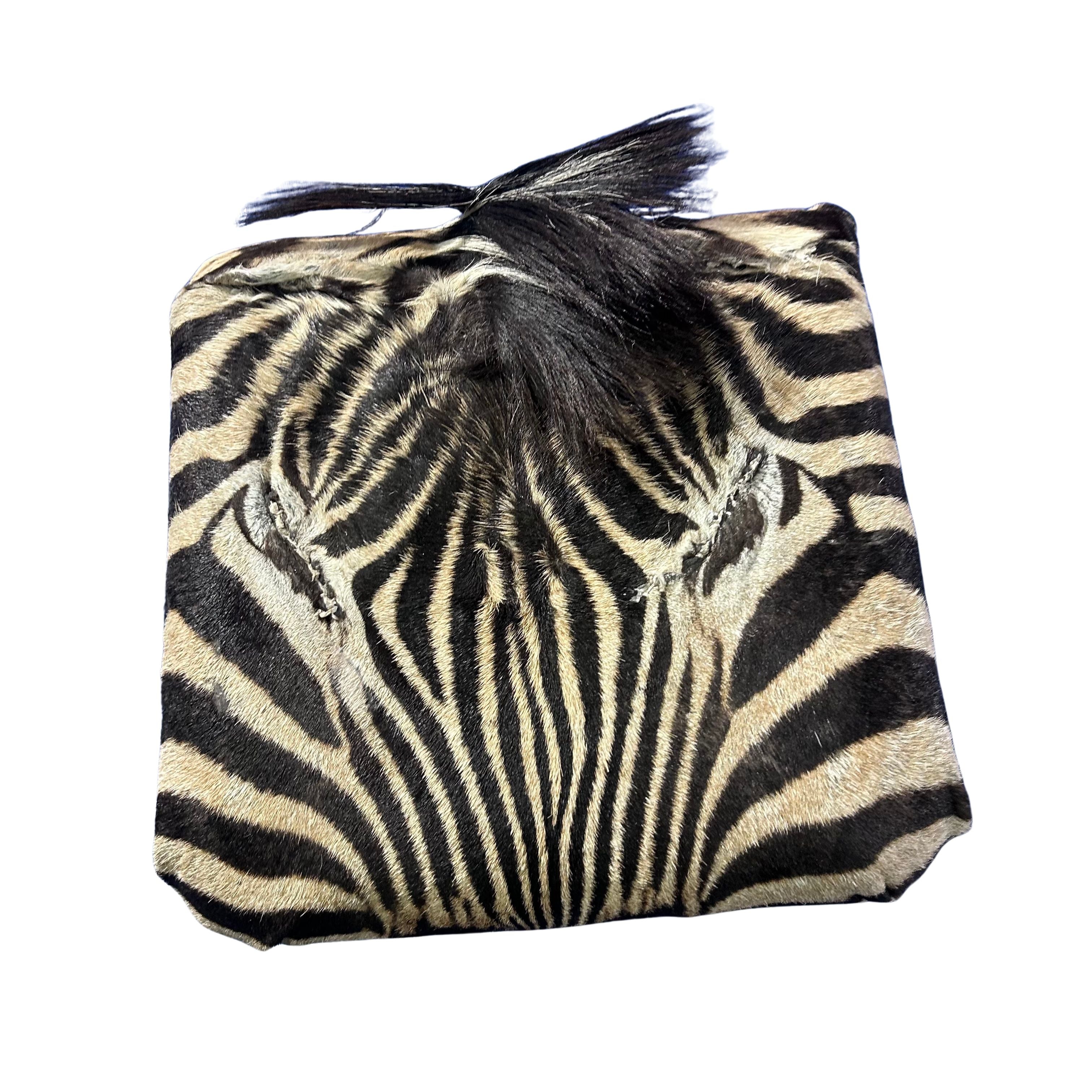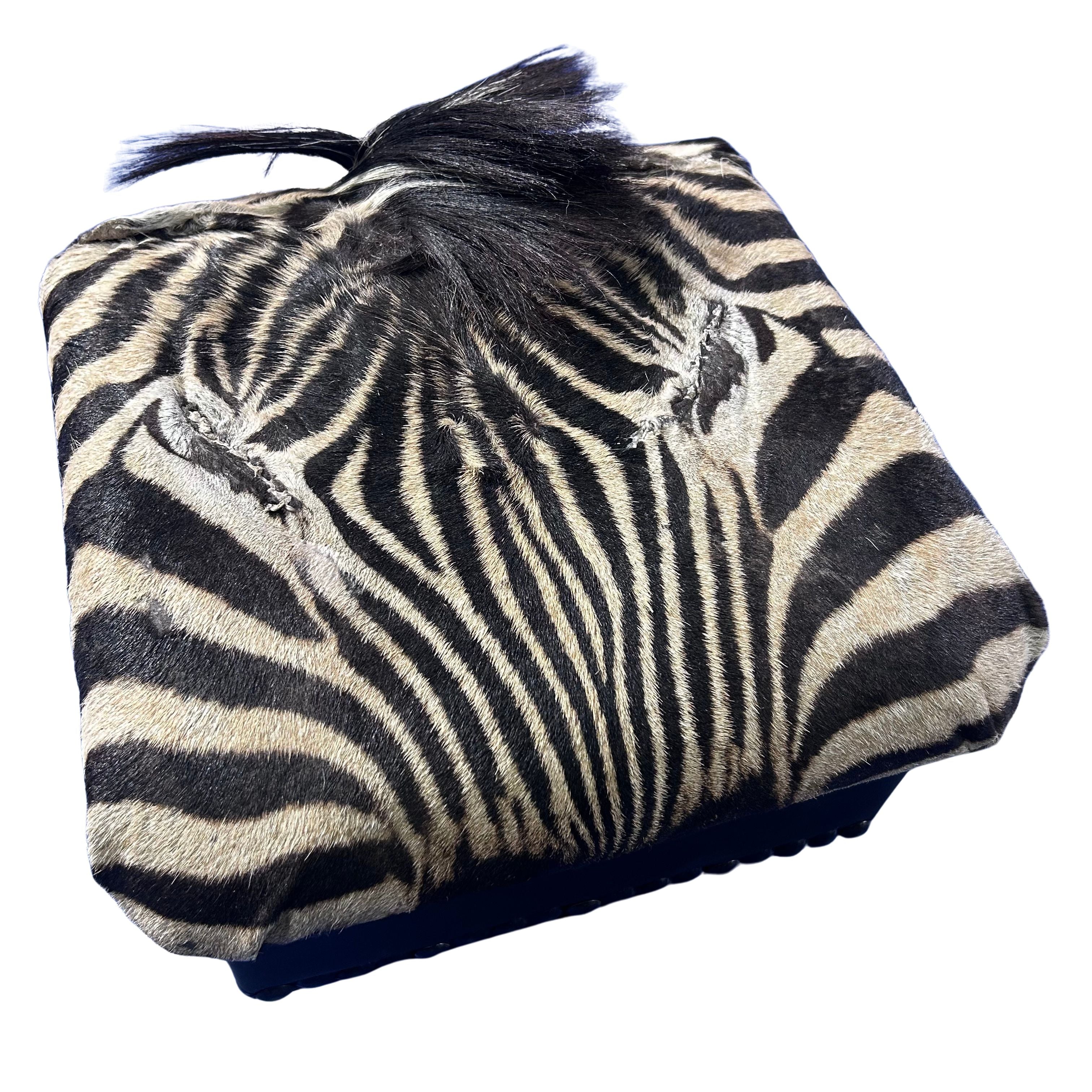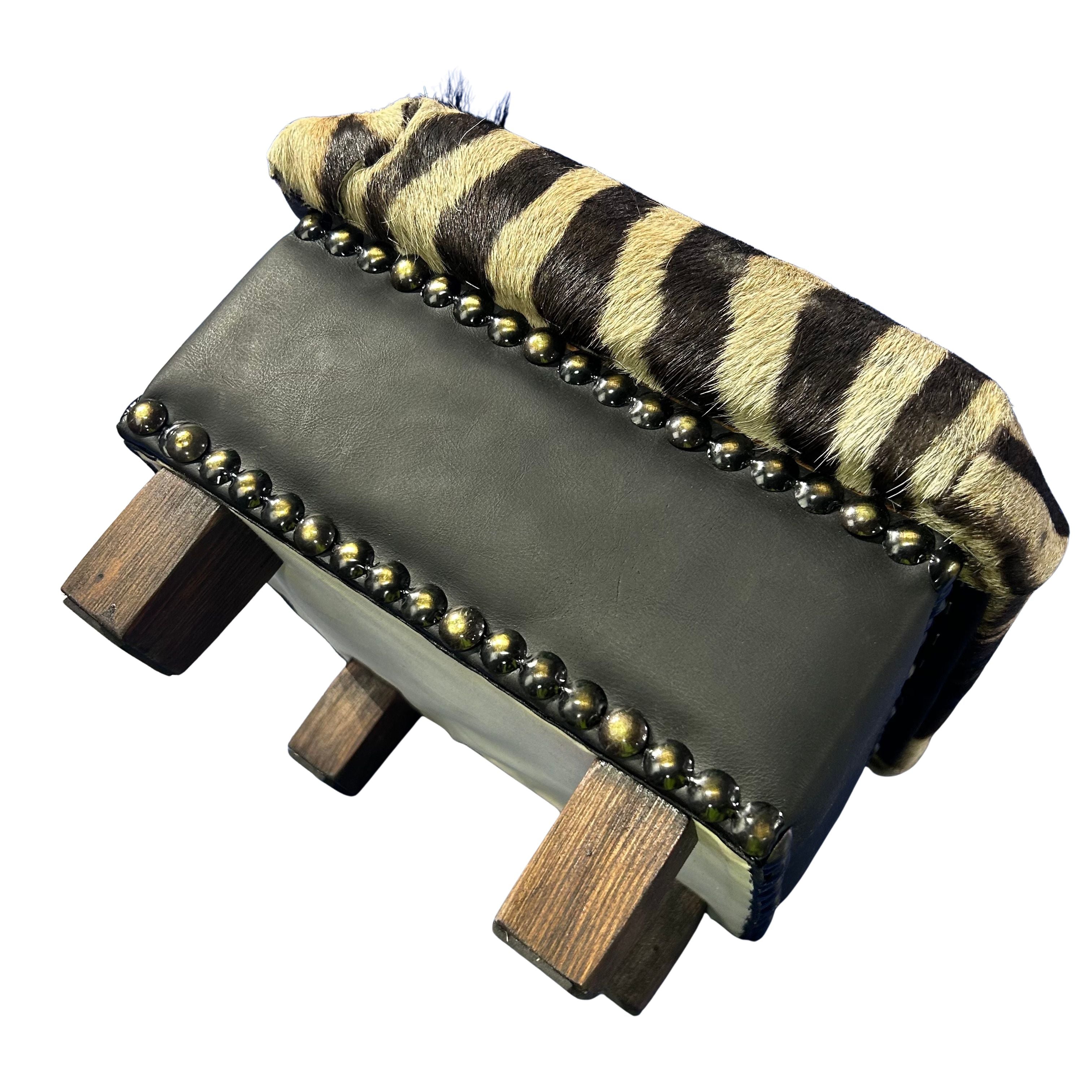 Indulge in luxury with our Real Zebra Skin Foot Stool. Made of authentic zebra skin, this hair-on mini ottoman adds a touch of opulence to any room. Perfect for resting your feet or as a unique statement piece. Elevate your space with this exclusive item from Africa. A Real Zebra Skin Foot Stool. Simply gorgeous and sure to make a high impact in any decor! This real zebra foot stool or real zebra hide ottoman is made out of the zebra face skin at the top and smooth leather on the sides. The African Burchell's Zebra inhabits dry savanna, grassland, shrub land, subtropical grassland of the African Continent. Yellowish, white or beige with broad, transverse, stripes on the hind parts. Stripes on the flanks extend down to the belly. Frequently yellowish or greyish shadow strips between the black strips. Animal skins such as real zebra skins, cowhides, bison skins and axis deer hides are always a byproduct of the meat industry or are harvested in order to reduce the numbers to an optimum quantity which would not damage the environment . So when you purchase a zebra skin, cowhide or deer skin know you are helping utilize a part of the...