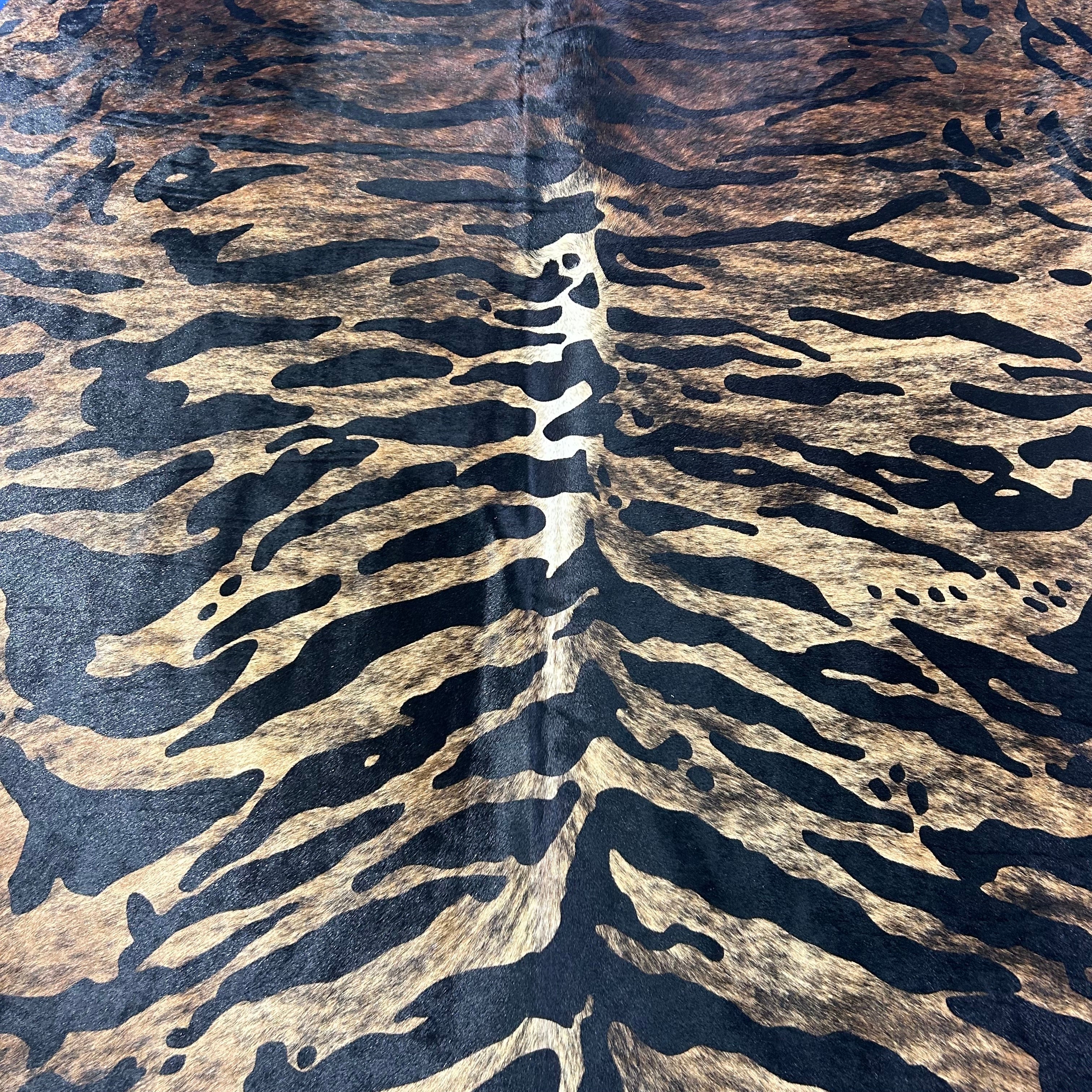 This is a beautiful Tiger Printed Cowhide Rug. Please see attached pictures that show in detail the type and quality of the skin.