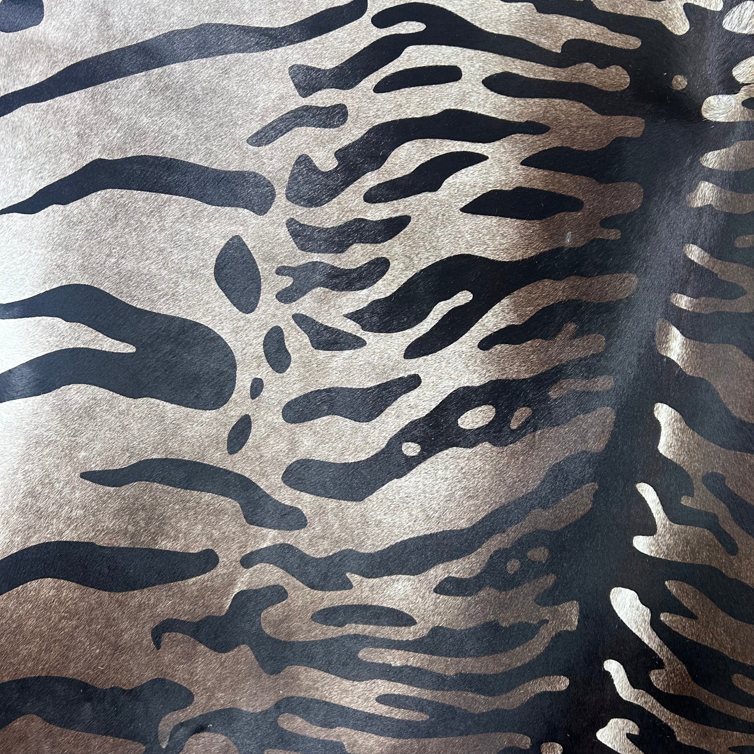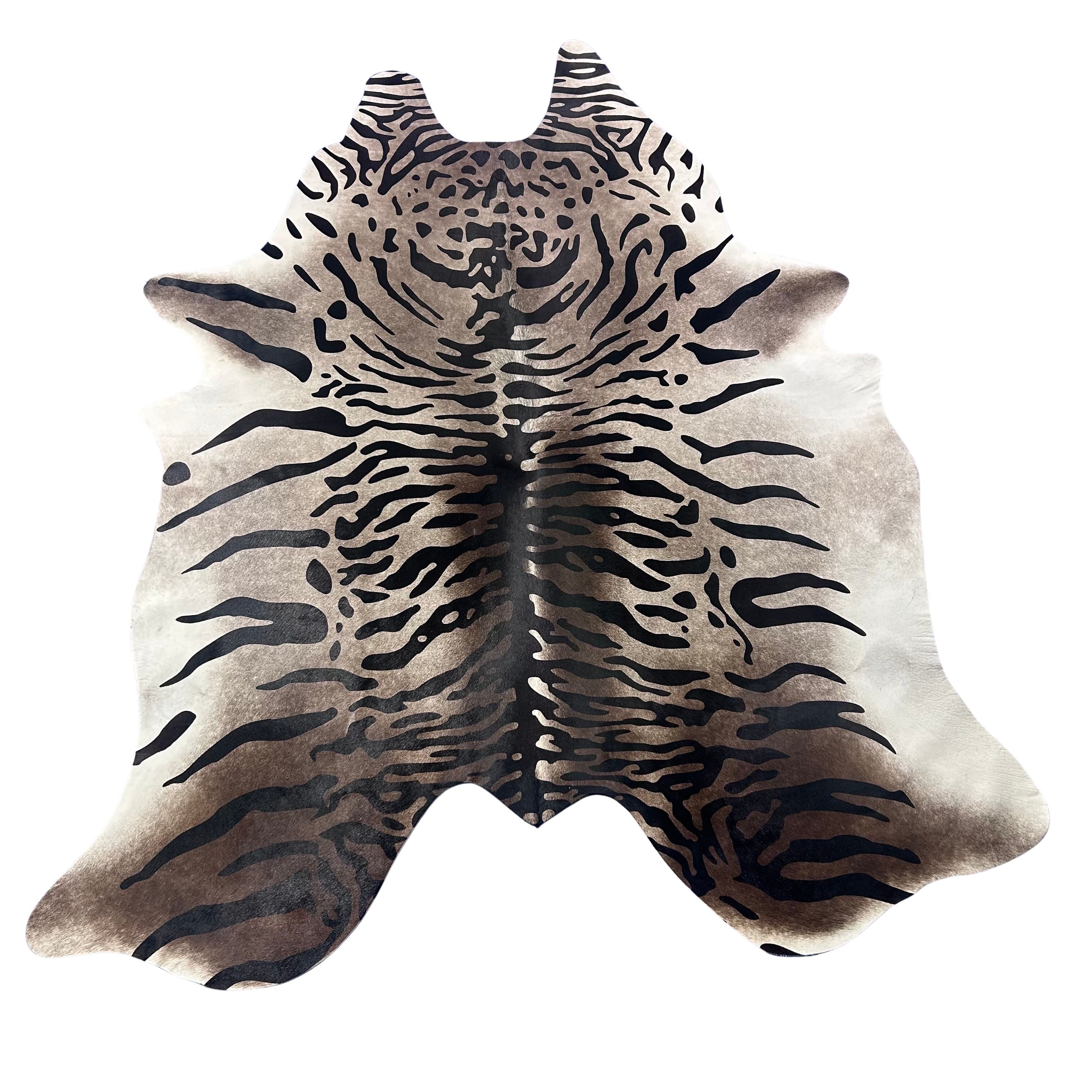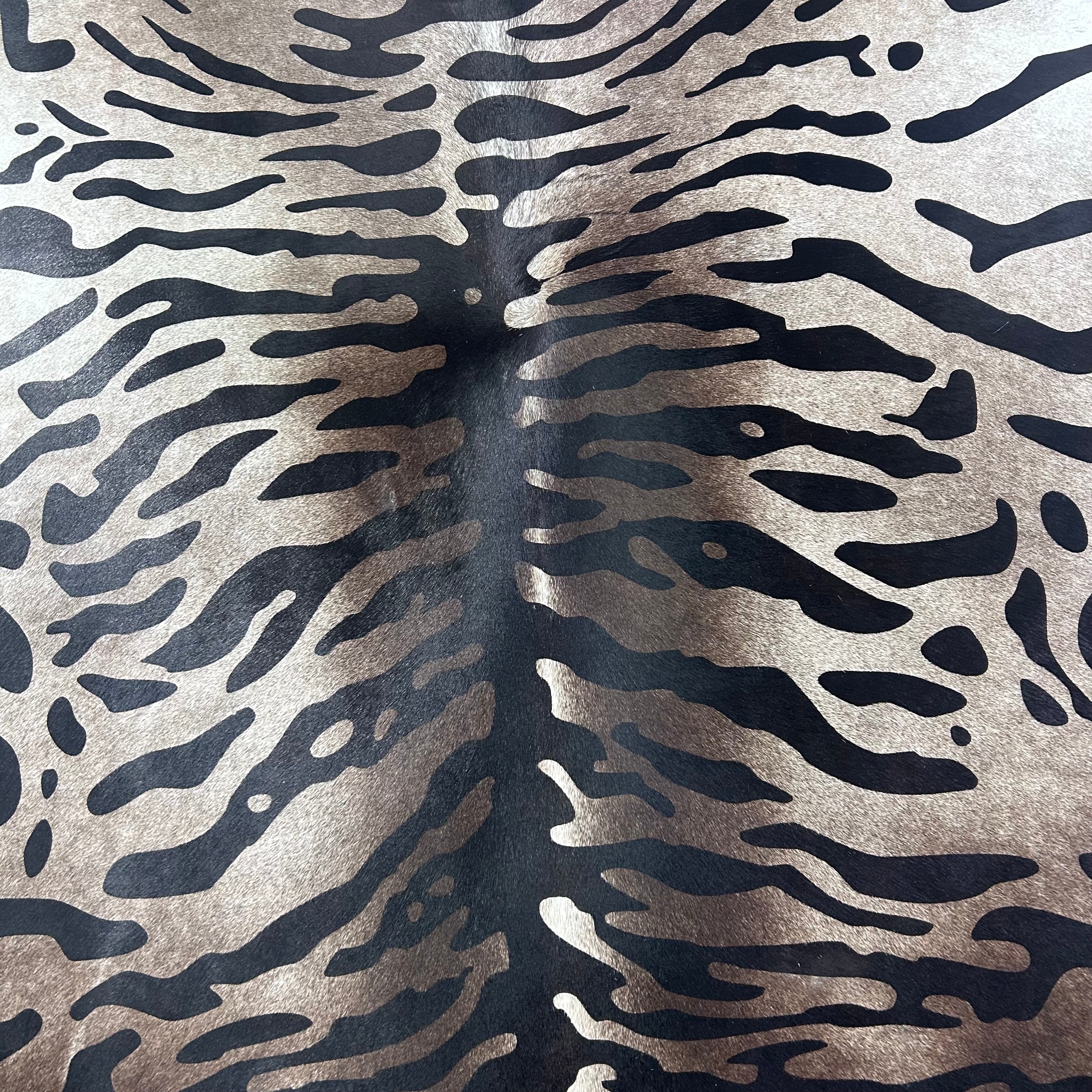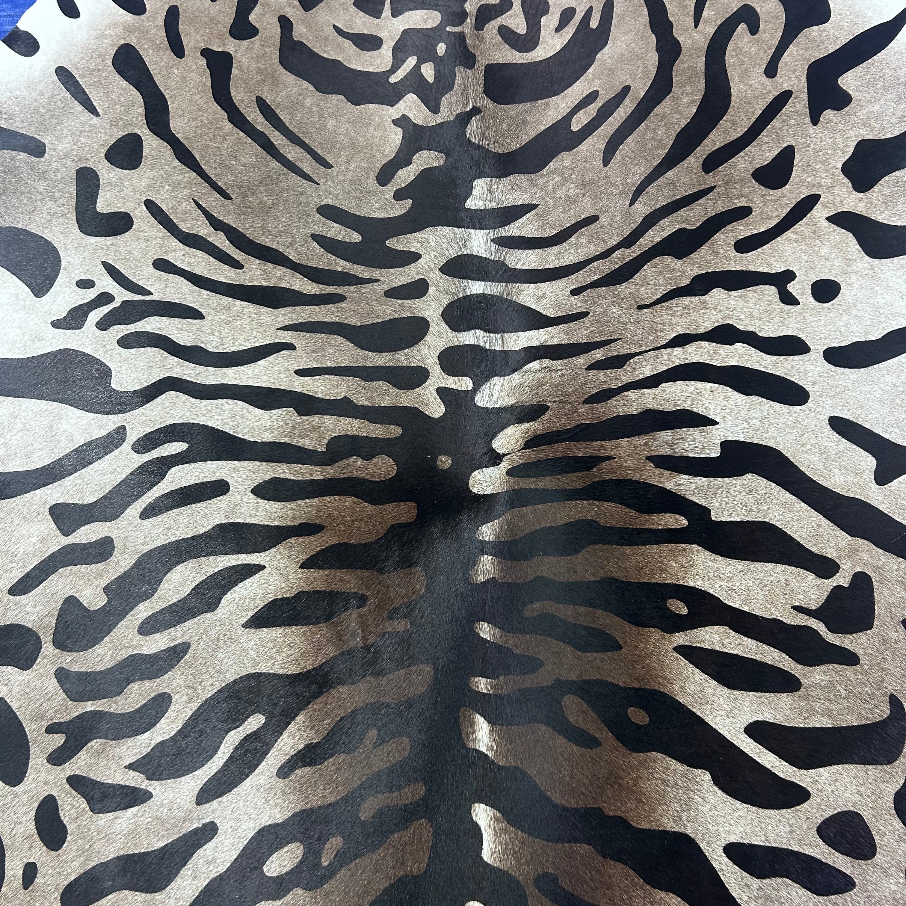 This is a beautiful Tiger Printed Cowhide Rug. Please see attached pictures that show in detail the type and quality of the skin.