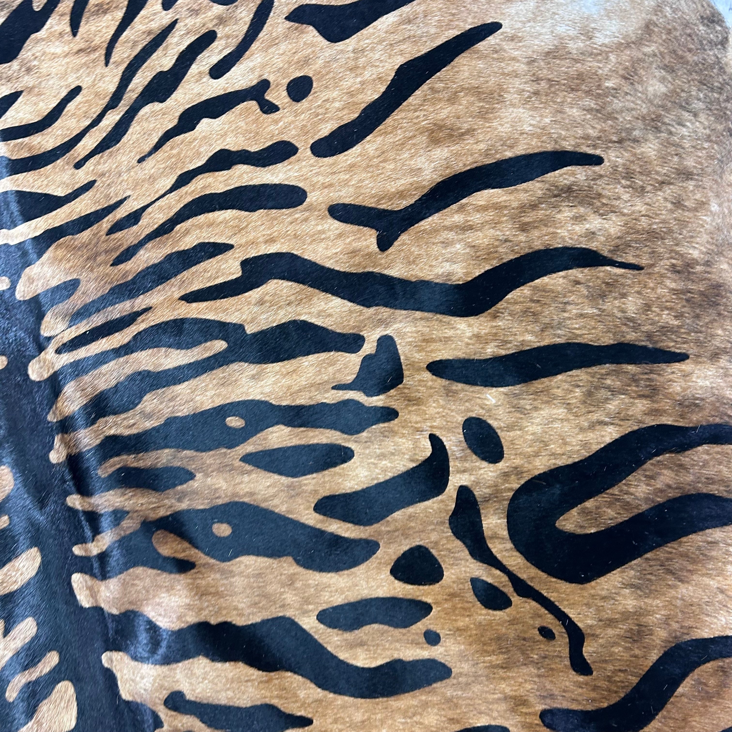 This is a beautiful Tiger Printed Cowhide Rug. Please see attached pictures that show in detail the type and quality of the skin.