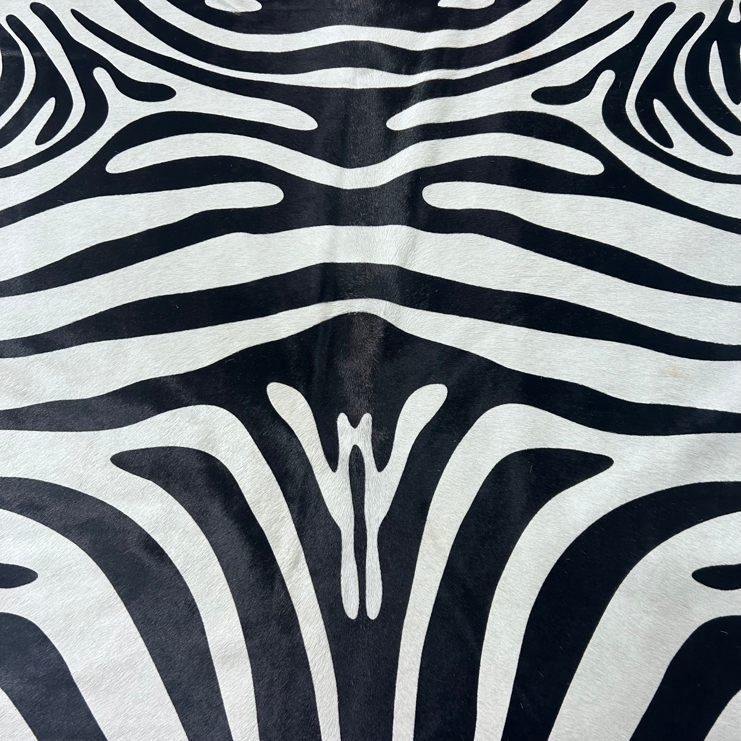 What a stunner! This is a beautiful Zebra Print Cowhide Rug (good quality/ one small blurry spot at the bottom left leg). Perfectly cut!