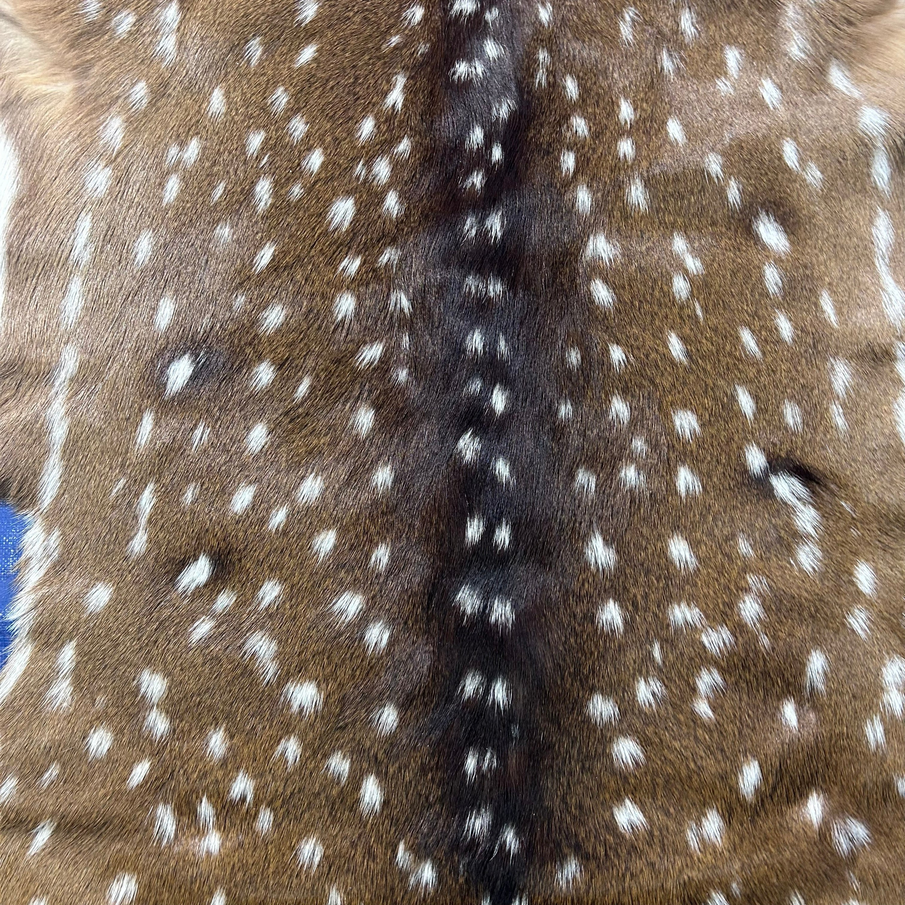 This is a nice axis deer skin rug that can be used as a floor rug or to manufacture products. Many of our clients use these skins for upholstery. Please see attached pictures that show in detail the type of hair and quality of the skin.