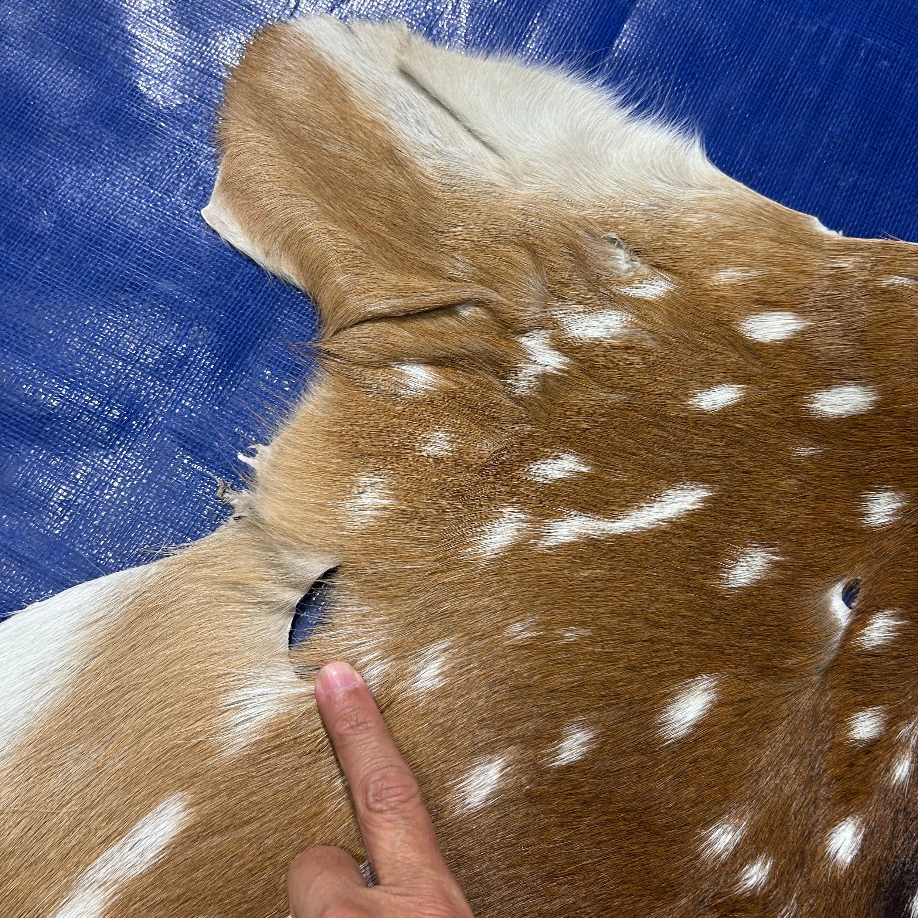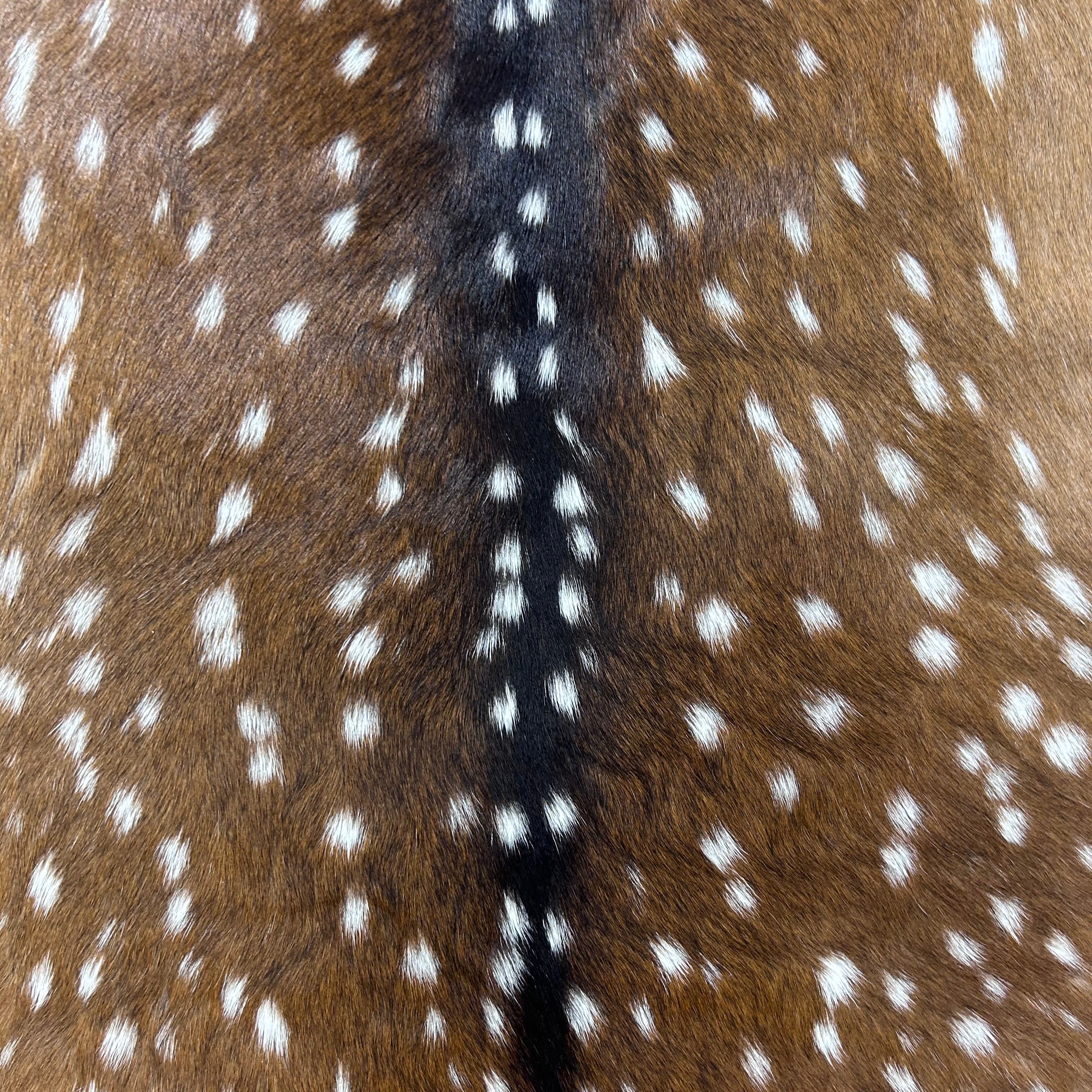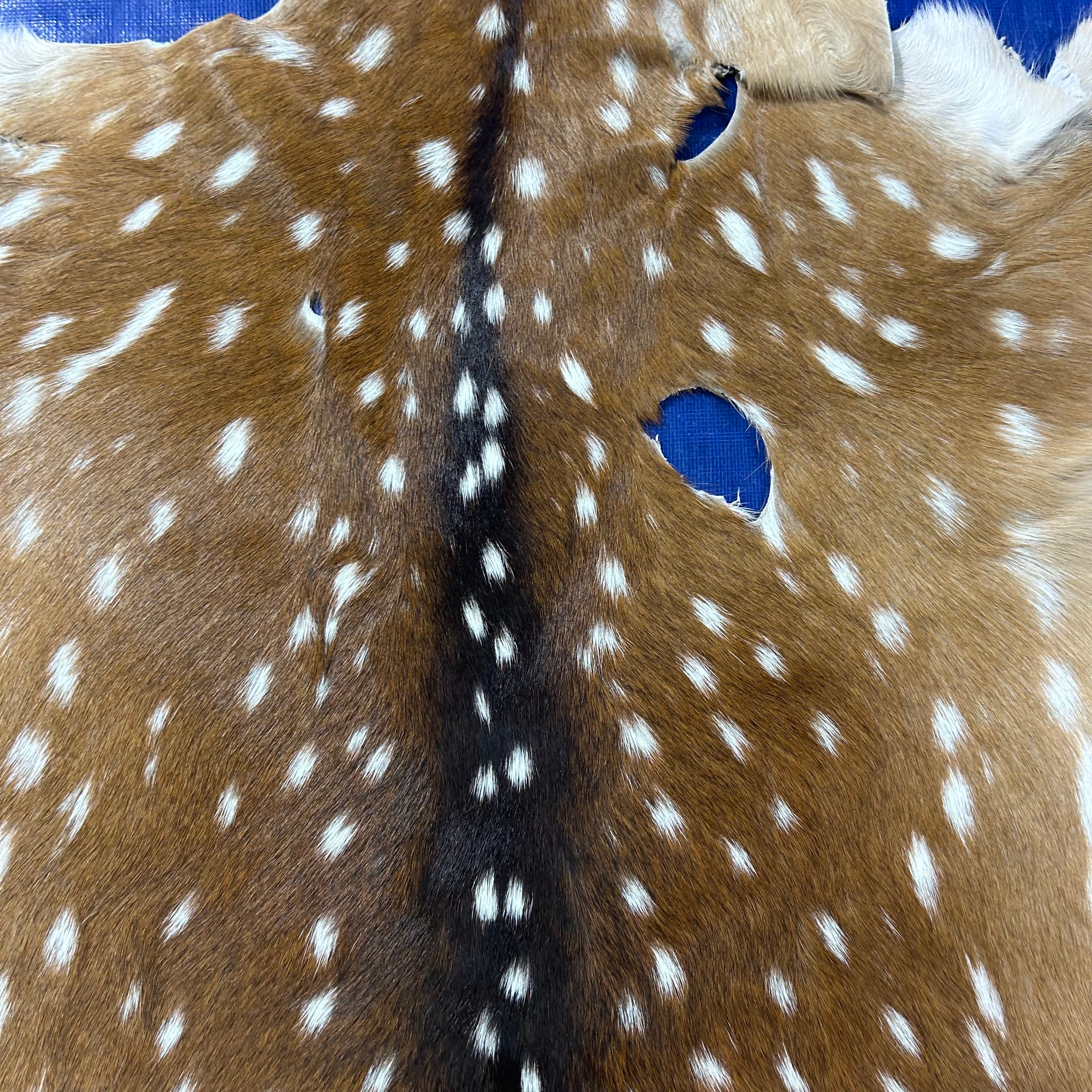 This is a nice axis deer skin rug that can be used as a floor rug or to manufacture products. Many of our clients use these skins for upholstery. Please see attached pictures that show in detail the type of hair and quality of the skin.