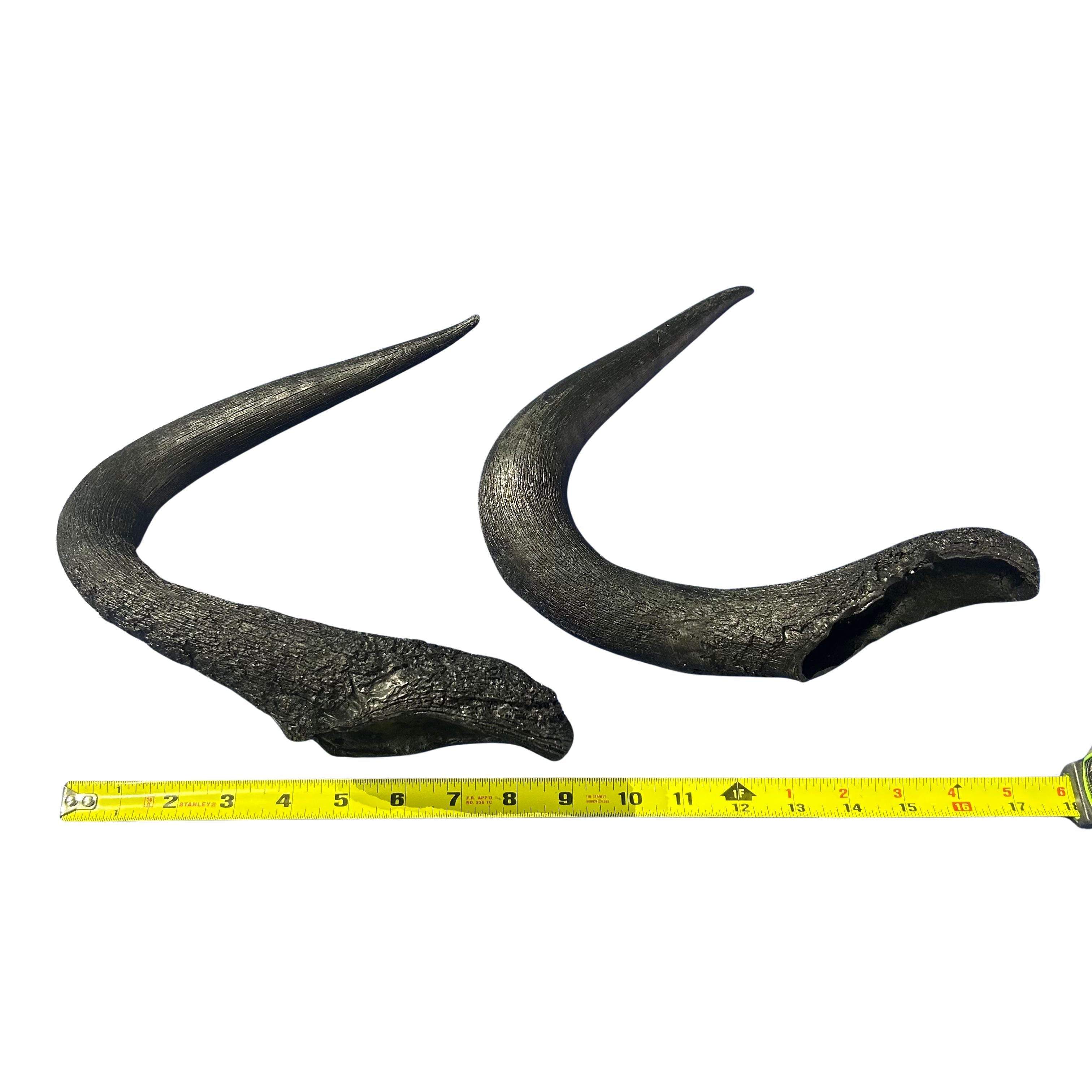 You will receive a set of horns from our inventory. Please check all photos.Real wildebeest antelope horns. Size is about 9" measured straight.The wildebeest is a big size antelope found mainly in Eastern and Southern subsaharan Africa. It is abundant in countries such as South Africa, Zimbabwe, Namibia, Tanzania, Zambia and Mozambique. Males have horns and females do not.These horns have been removed from the skull, cleaned, hollowed and disinfected. Can be used for making knife handles, door handles, or even bottle openers. Can also he used for decoration or used to make costumes.