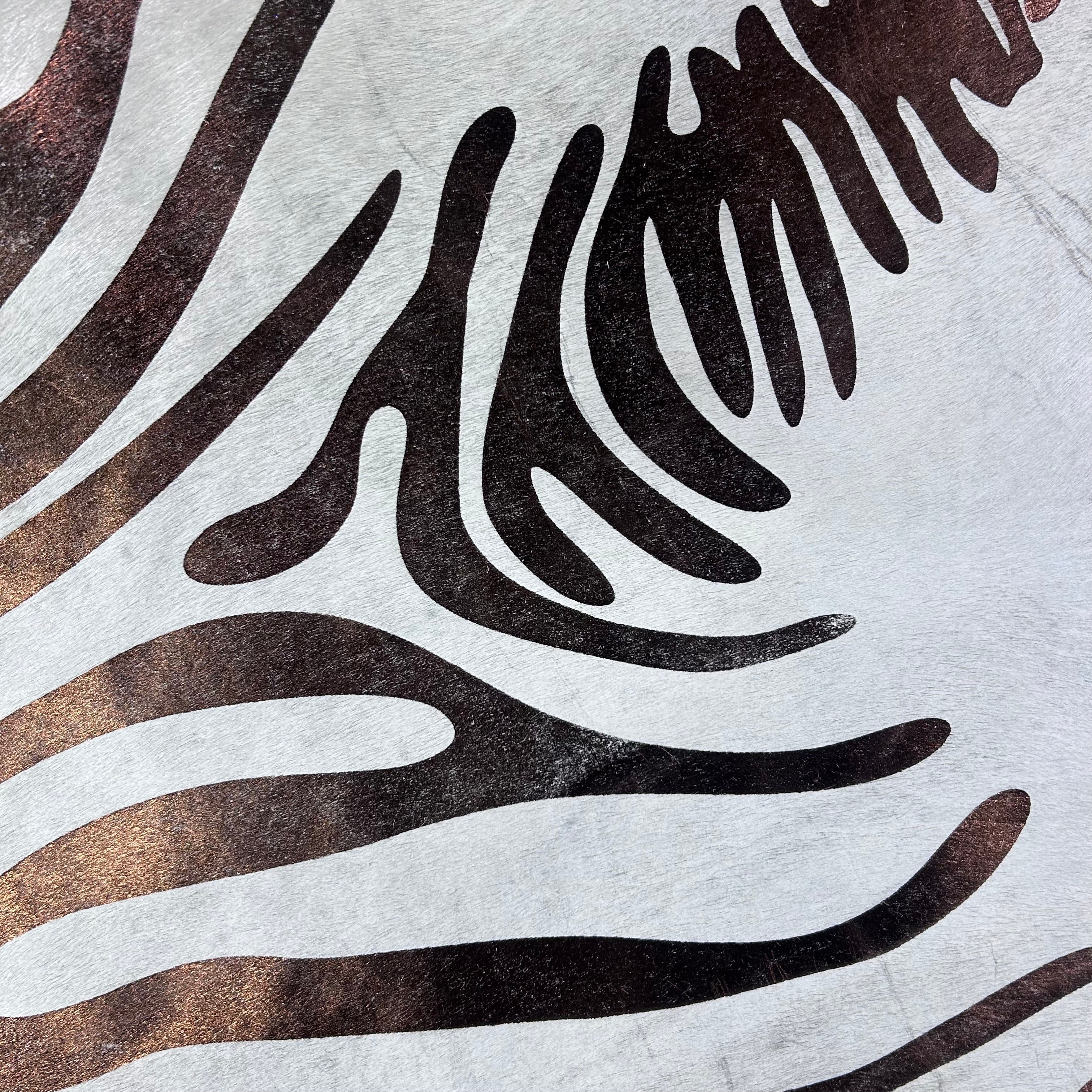 Transform your space with our stunning Metallic Zebra Print Cowhide Rug! This rug is both stylish and practical. Its unique design adds a touch of elegance to any room while its durable cowhide material ensures long-lasting quality. Make a bold statement in your home or office with this eye-catching rug!Other companies use generic photos and will ship you a similar rug. This is a photo of the exact skin we will ship and its measurements are accurate.