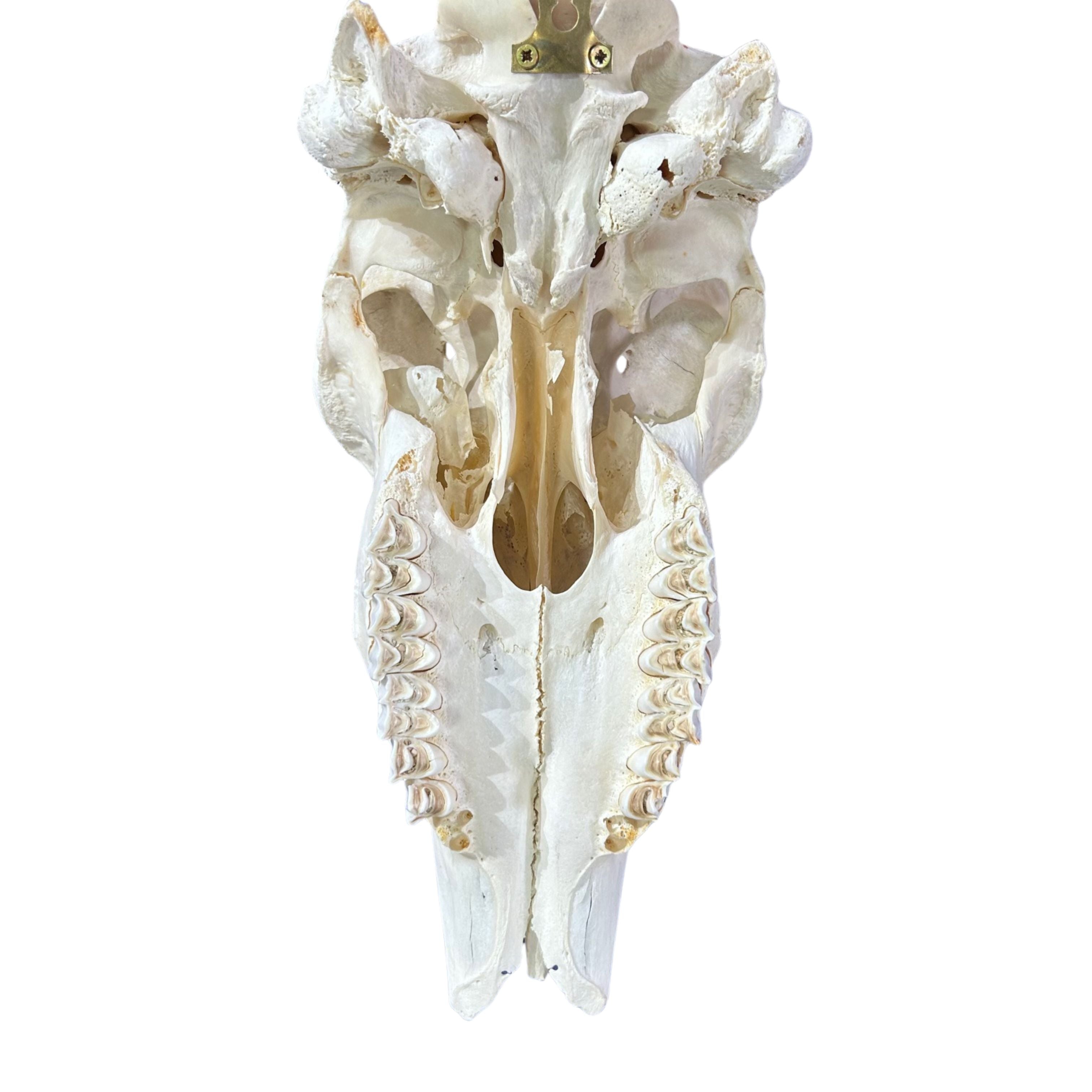 You will receive this EXACT skull.Add a unique touch to your home decor with this Real Eland Skull. Measuring around 45LX12WX8”D inches, this HUGE skull will make a bold statement in any room. Perfect for adding a touch of natural and exotic. The metal bracket on the back allows for easy wall hanging and the detachable horns allow us to ship the product to you very safely. You can also store it in a much safer fashion considering the horns completely detach from the skull occupying much less space. Assembly of the horns is very easy. Just slide the horns onto the bone stubs (see 2nd and 3rd photos).The Eland is a big size antelope found mainly in Eastern and Southern subsaharan Africa. It is abundant in countries such as South Africa, Zimbabwe, Namibia, Tanzania, Zambia and Mozambique. Males have horns and females do as well. However, female eland horns are much thinner than the male ones. This is definitely a very long set of horns for a female skull.This skull has been completely cleaned following strict taxidermy standards, the horns have been removed from the base and hollowed out and a metal bracket is screwed onto the back of...