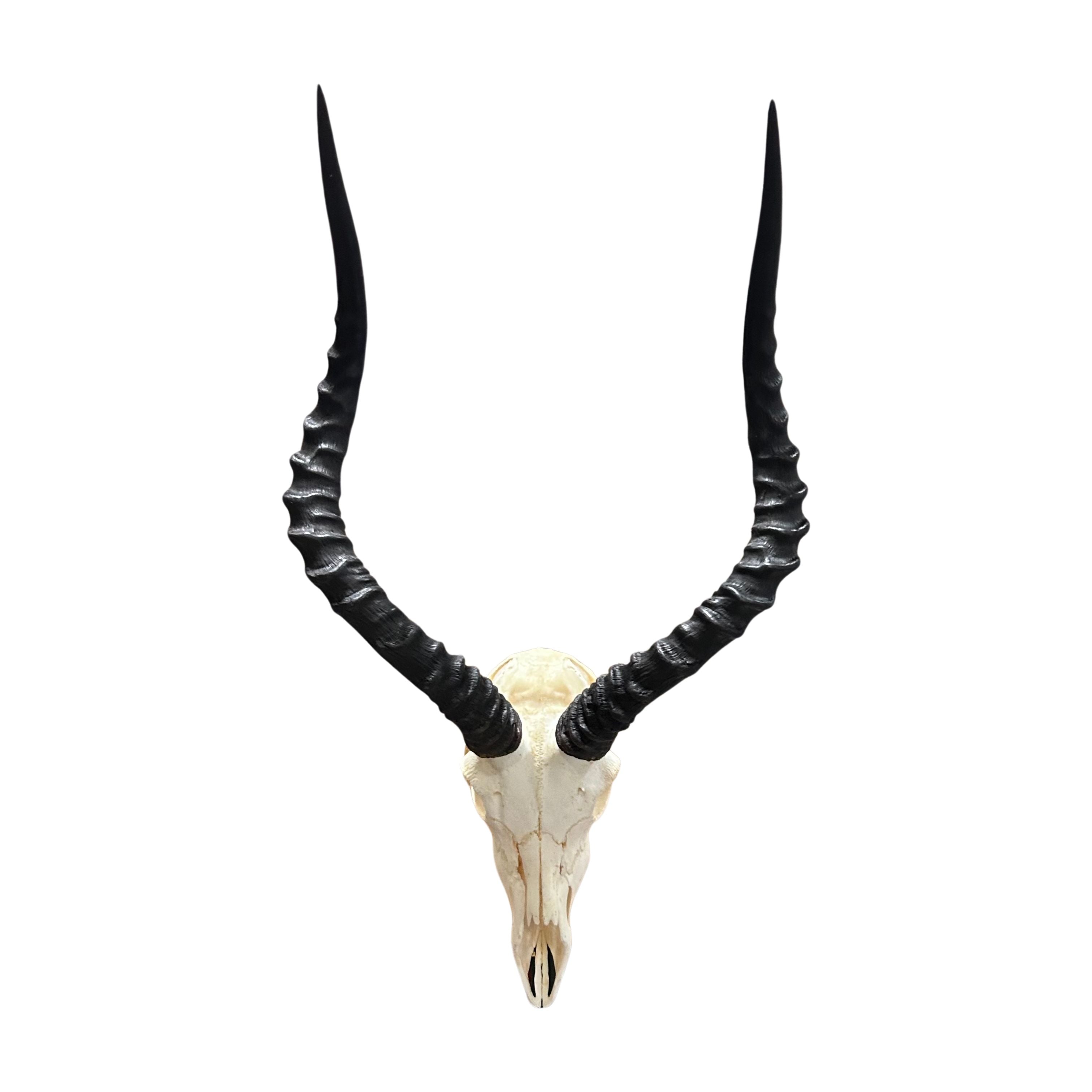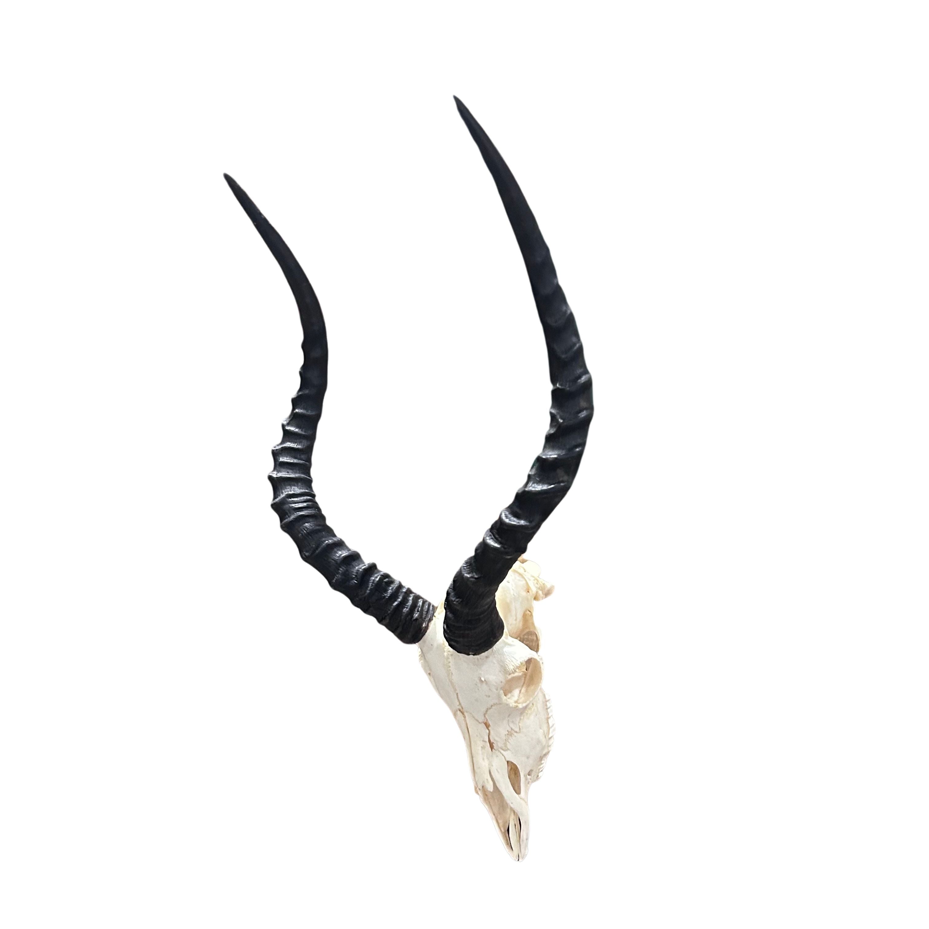 You will receive this exact skull. Awesome size and lots of character. Horns are 22" measured around the curve which make it an exceptional trophy.Add a unique touch to your home decor with this Real Impala Skull. Measuring around 27HX14WX11D inches, this impala skull will make a bold statement in any room. Perfect for adding a touch of natural and exotic. The metal bracket on the back allows for easy wall hanging.The impala or rooibok is a medium size antelope found mainly in Eastern and Southern subsaharan Africa. It is very abundant in countries such as South Africa, Zimbabwe, Tanzania, Zambia and Mozambique. Males have horns and females do not. Therefore all the impala skulls we offer are male impala.This skull has been completely cleaned following strict taxidermy standards. There is a metal bracket on the back for easy wall hanging.