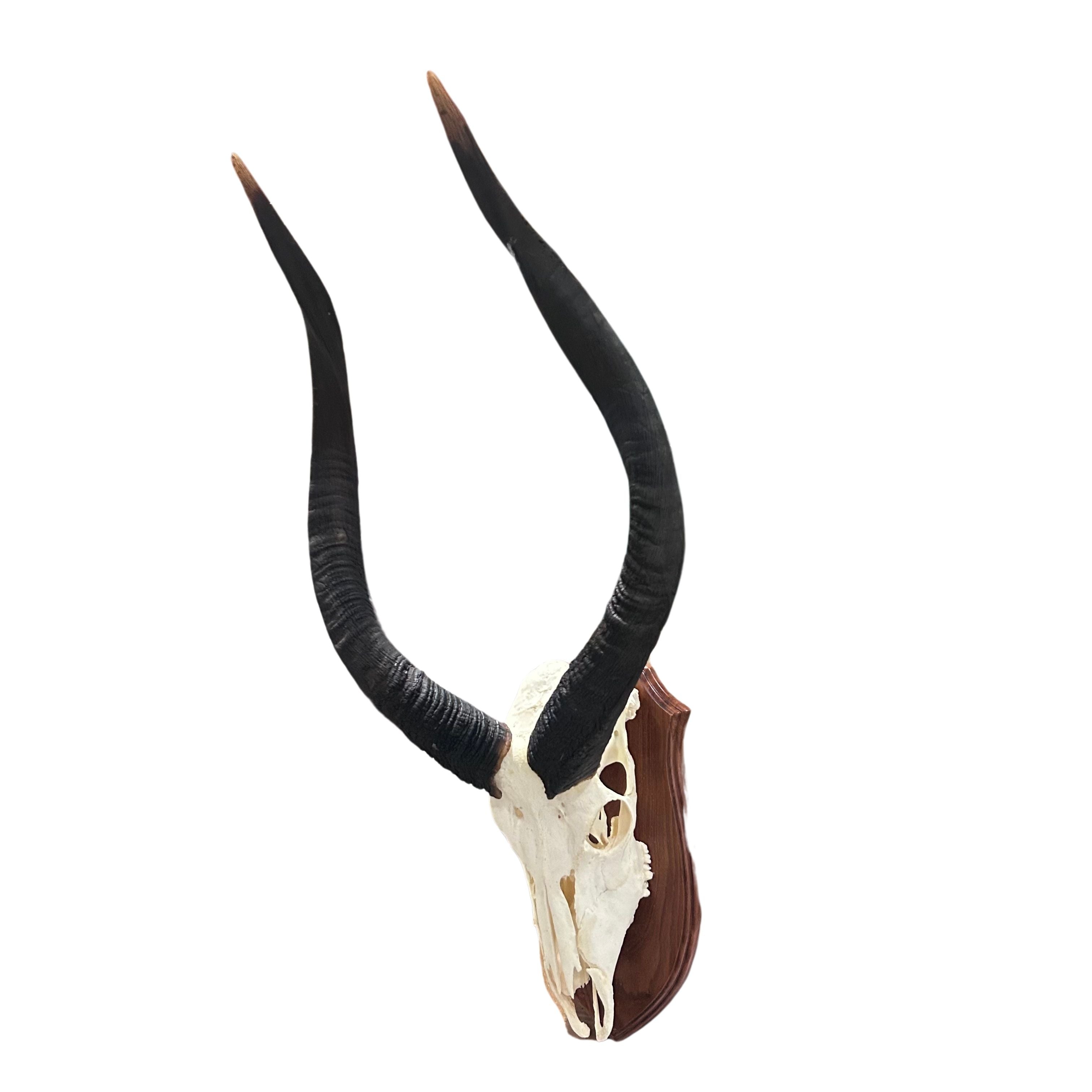 Genuine Nyala Skull.Horns are detachable for easy shipping. Comes with a metal bracket on the back for easy wall hanging. Please note the skull does not have all teeth (see all photos).Horns are about 27 inches when measured around the curls. The horns don't complete a full curl because they are from a juvenile animal.Skull Only: 12X7X7 inchesAssembled Skull: 30X15X14 inchesObtained ethically from overpopulation herds in South Africa.