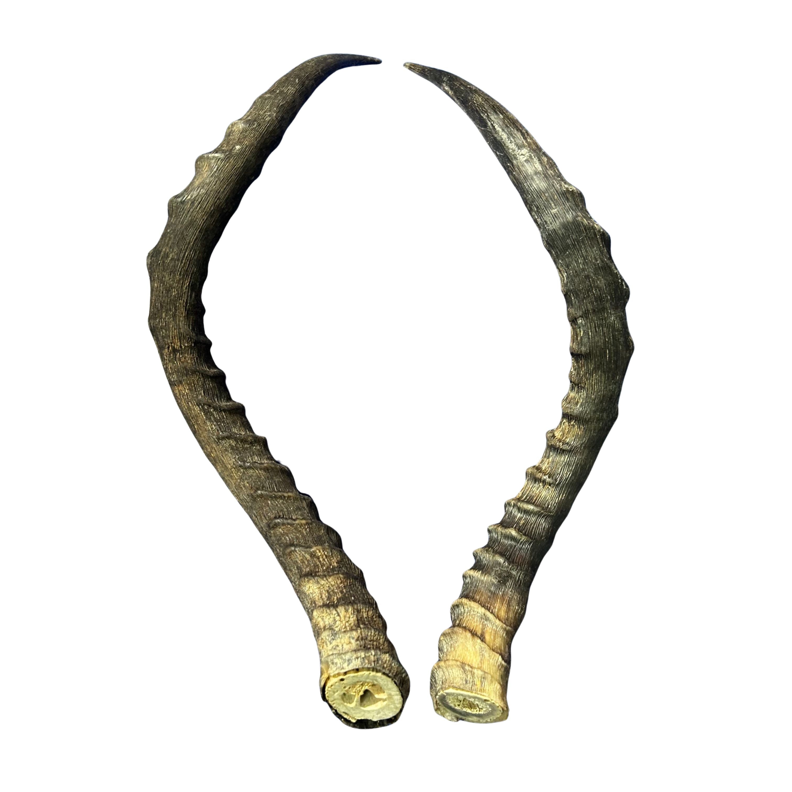 You will receive similar ones from our inventory.Real Set of impala antelope horns. Around 20" long (measured along the curve). Inner bone inside the horns (see 2nd and 3rd photos).The impala is an antelope found mainly in subsaharan Africa. It is very abundant in countries such as South Africa, Zimbabwe, Tanzania, Zambia and Mozambique.These horns have been cut from the skull and cleaned. Can be used for making knife handle, door handles, or even bottle openers. Can also he used for decoration.