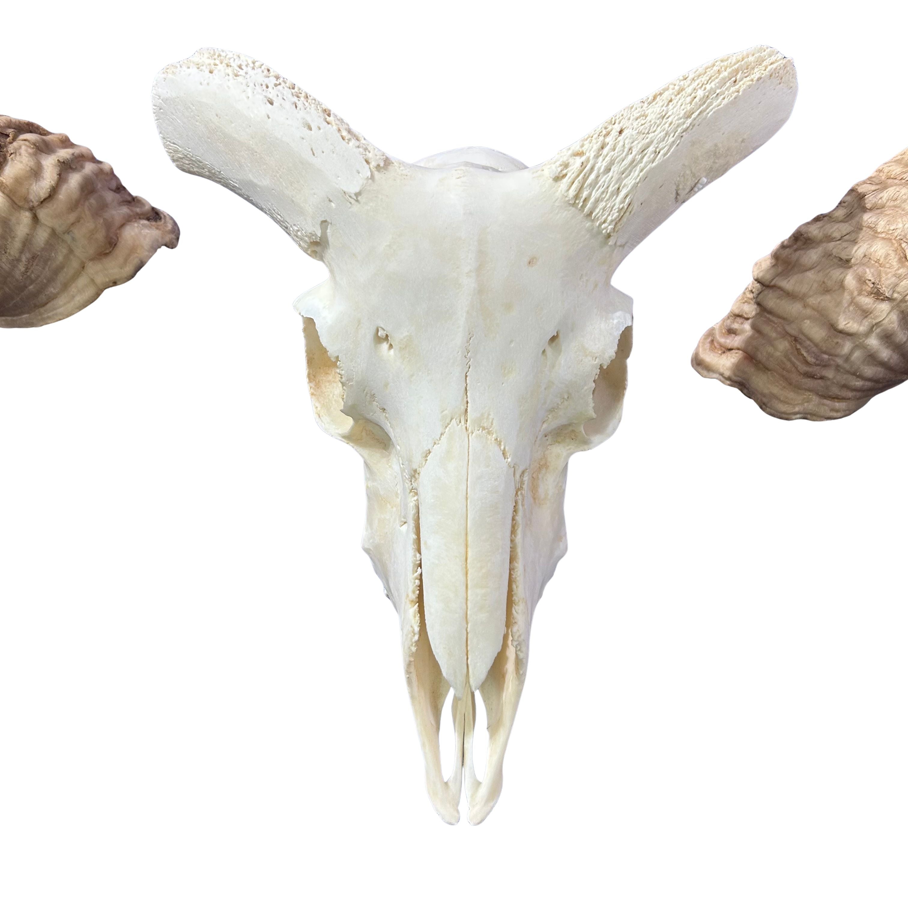You will receive this EXACT skull. Horns detach for easy shipping. The horns measure 28 and 29" when measured around the curls.Add a unique touch to your home decor with this Real Merino Ram Skull. Measuring around 13LX21WX7D inches, this gorgeous skull will make a bold statement in any room. Perfect for adding a touch of natural and exotic. You can also store it in a much safer fashion considering the horns completely detach from the skull occupying much less space. Assembly of the horns is very easy. Just slide the horns onto the bone stubs (see 2nd and 3rd photos).This skull has been completely cleaned following strict taxidermy standards, the horns have been removed from the base and hollowed out.