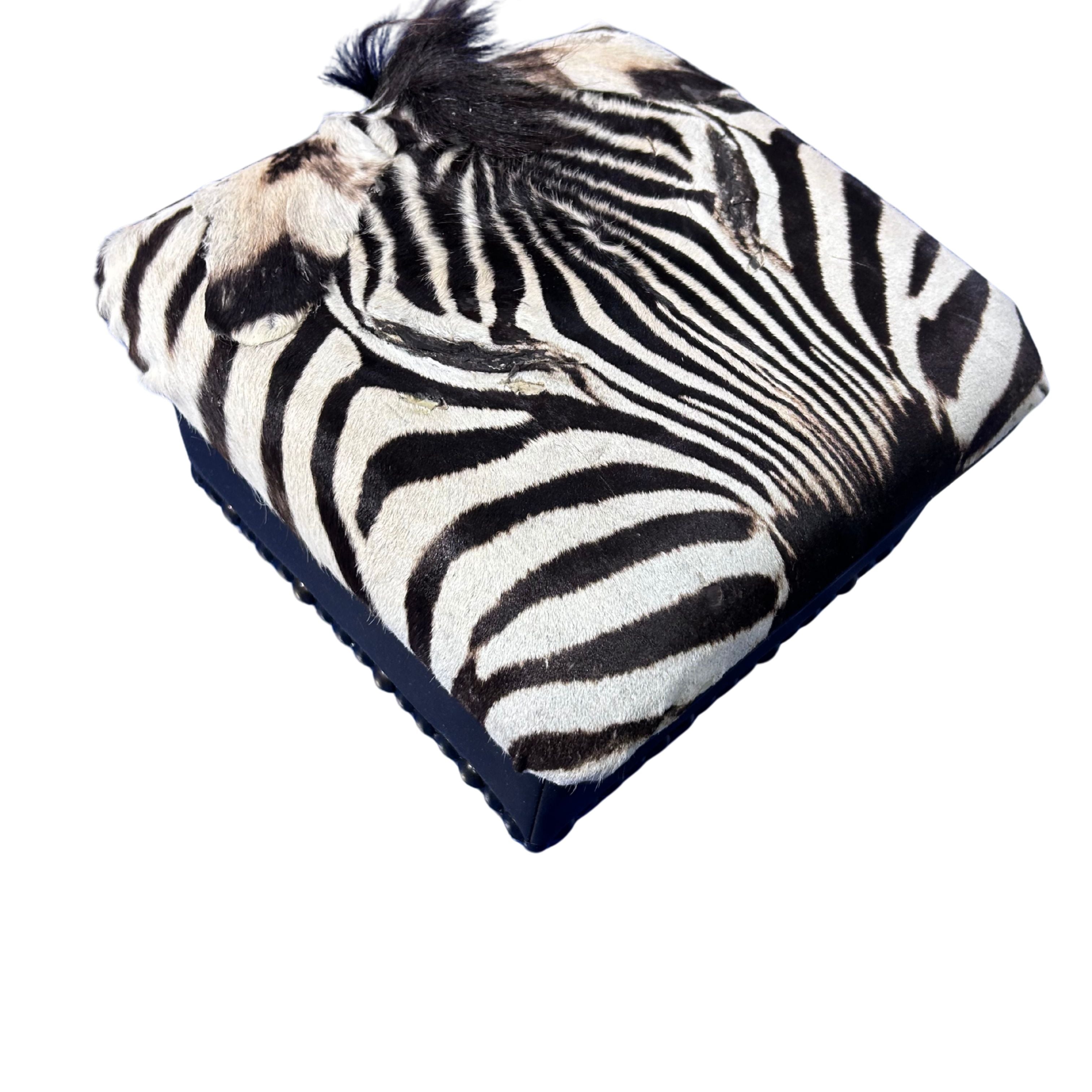 Indulge in luxury with our Real Zebra Skin Foot Stool. Made of authentic zebra skin, this hair-on mini ottoman adds a touch of opulence to any room. Perfect for resting your feet or as a unique statement piece. Elevate your space with this exclusive item from Africa. A Real Zebra Skin Foot Stool. Simply gorgeous and sure to make a high impact in any decor! This real zebra foot stool or real zebra hide ottoman is made out of the zebra face skin at the top and smooth leather on the sides. The African Burchell's Zebra inhabits dry savanna, grassland, shrub land, subtropical grassland of the African Continent. Yellowish, white or beige with broad, transverse, stripes on the hind parts. Stripes on the flanks extend down to the belly. Frequently yellowish or greyish shadow strips between the black strips. Animal skins such as real zebra skins, cowhides, bison skins and axis deer hides are always a byproduct of the meat industry or are harvested in order to reduce the numbers to an optimum quantity which would not damage the environment . So when you purchase a zebra skin, cowhide or deer skin know you are helping utilize a part of the...