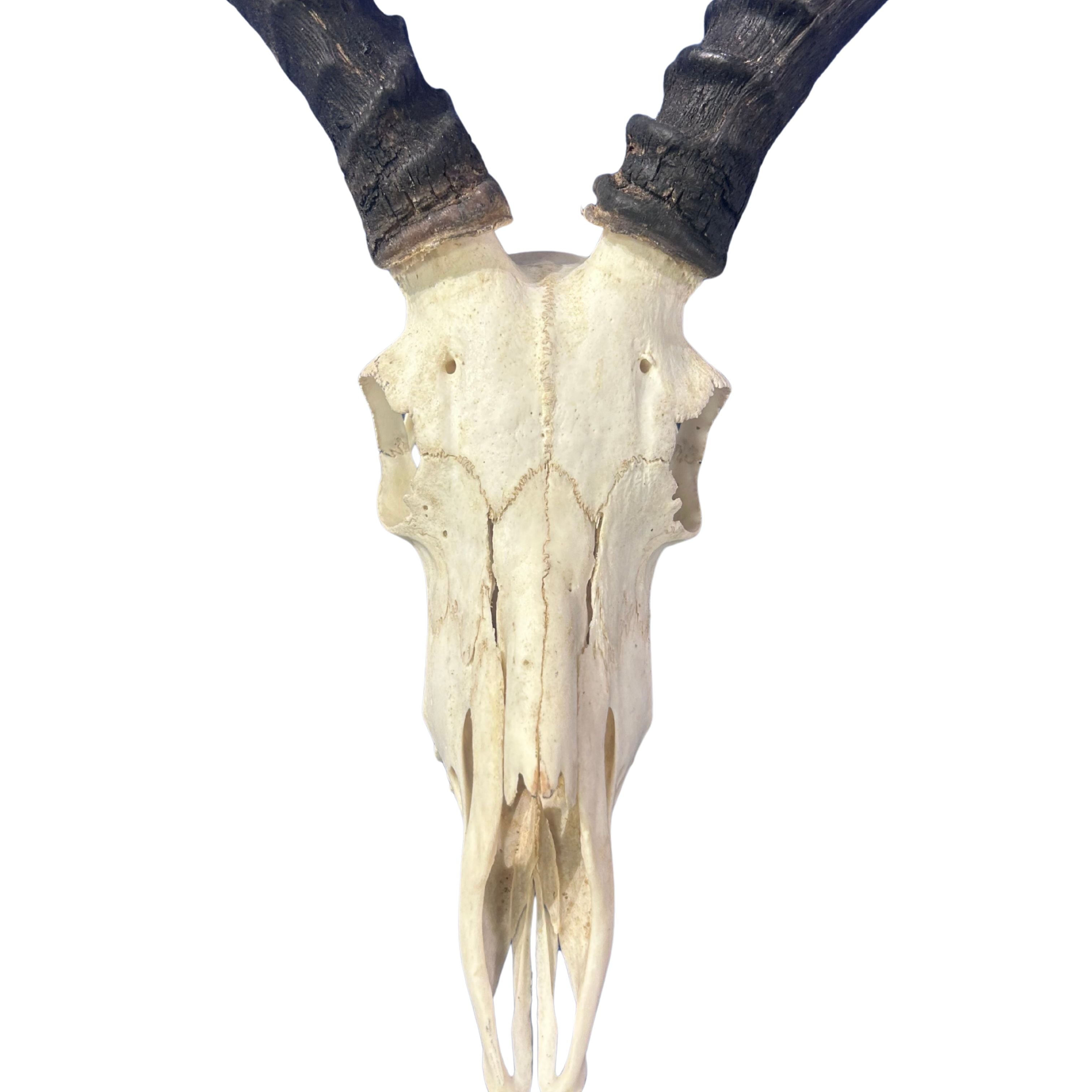 You will receive this exact skull. Awesome size and lots of character. Horns are 22" measured around the curve which make it an exceptional trophy.Add a unique touch to your home decor with this Real Impala Skull. Measuring around 27HX14WX11D inches, this impala skull will make a bold statement in any room. Perfect for adding a touch of natural and exotic. The metal bracket on the back allows for easy wall hanging.The impala or rooibok is a medium size antelope found mainly in Eastern and Southern subsaharan Africa. It is very abundant in countries such as South Africa, Zimbabwe, Tanzania, Zambia and Mozambique. Males have horns and females do not. Therefore all the impala skulls we offer are male impala.This skull has been completely cleaned following strict taxidermy standards. There is a metal bracket on the back for easy wall hanging.