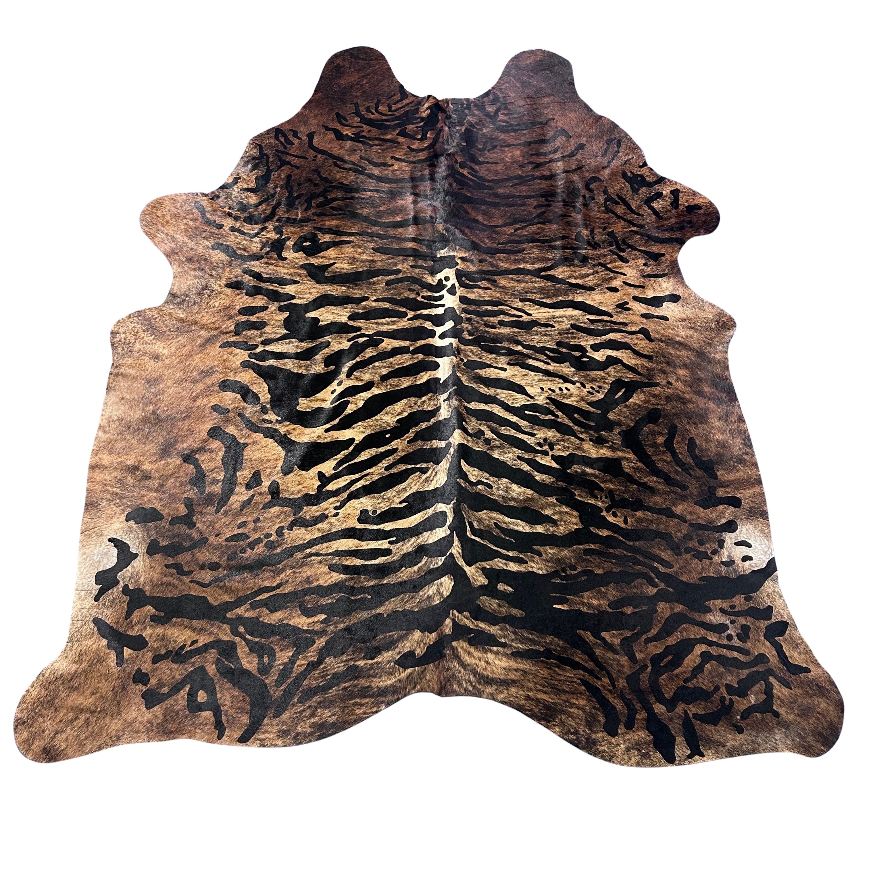 This is a beautiful Tiger Printed Cowhide Rug. Please see attached pictures that show in detail the type and quality of the skin.