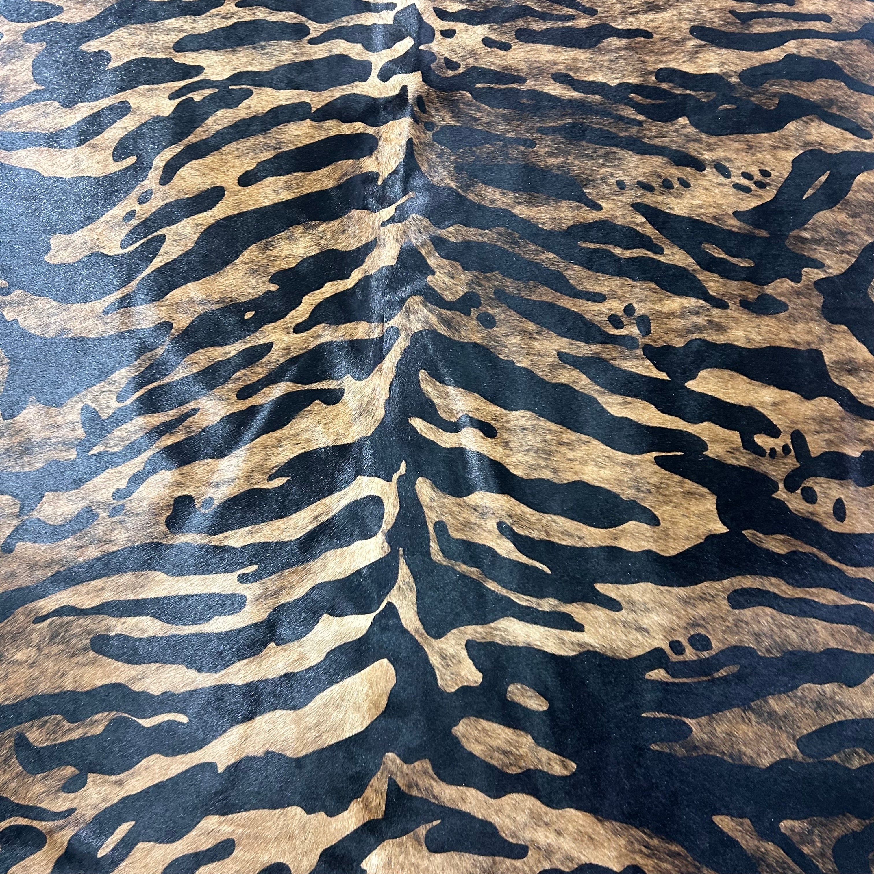 This is a beautiful Tiger Printed Cowhide Rug. Please see attached pictures that show in detail the type and quality of the skin.