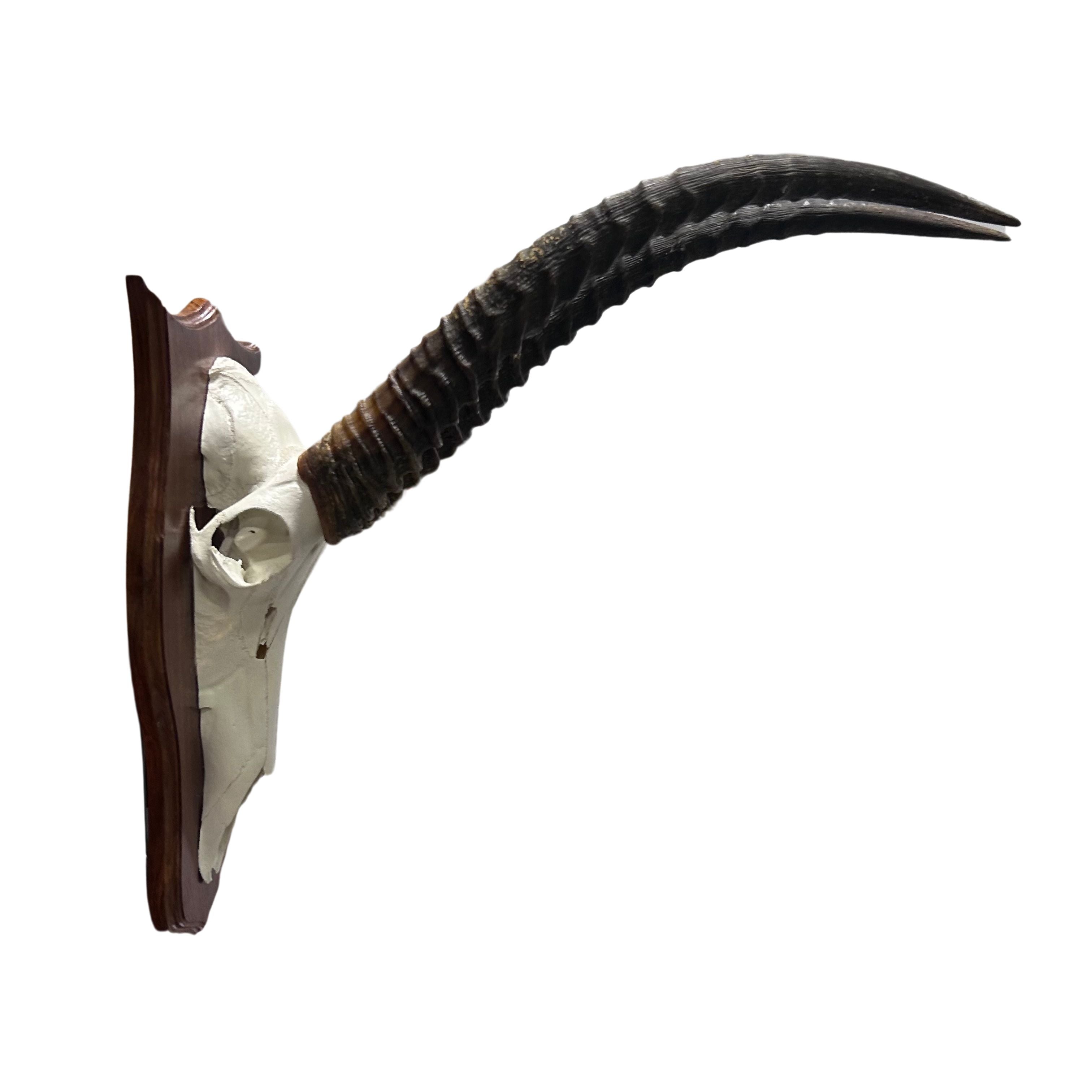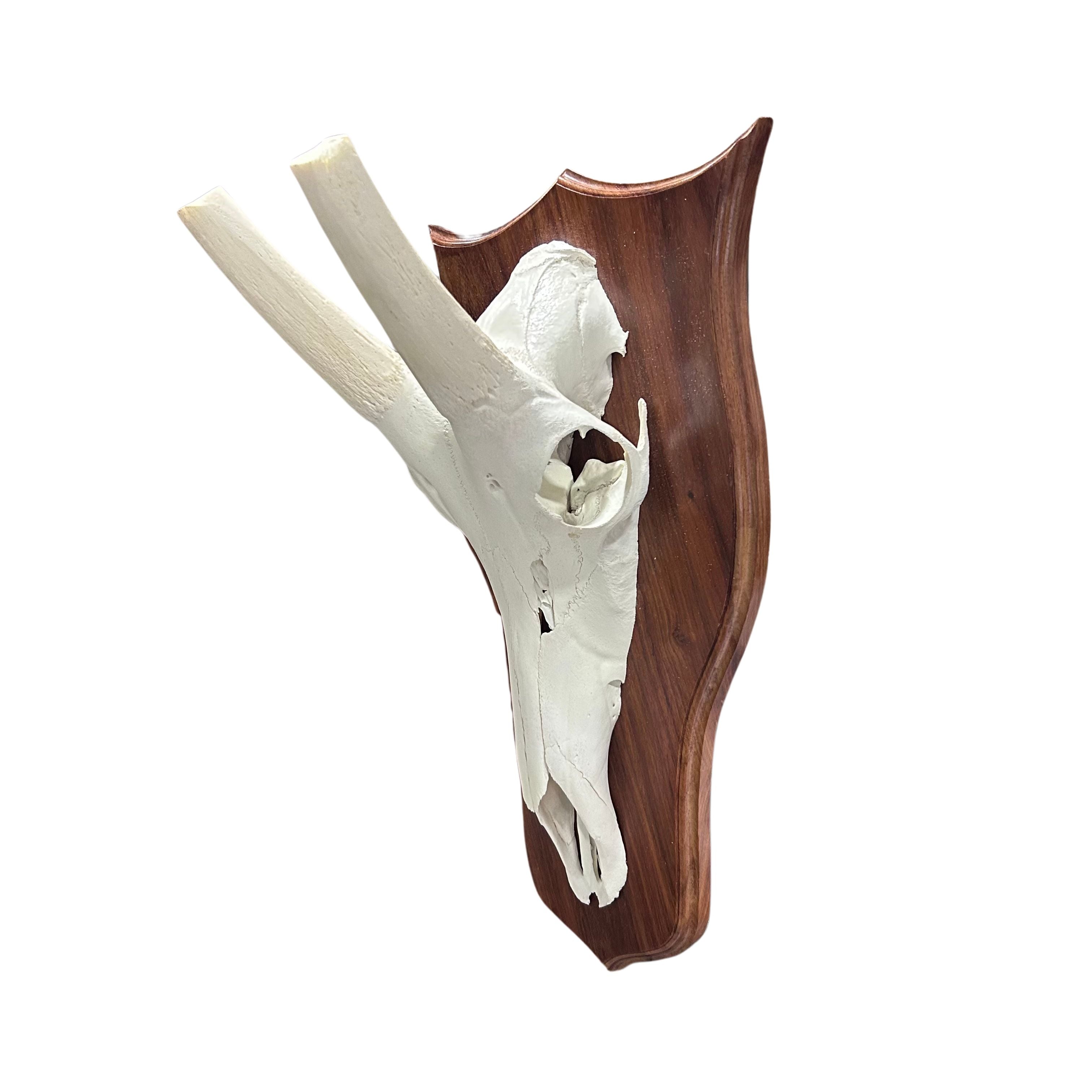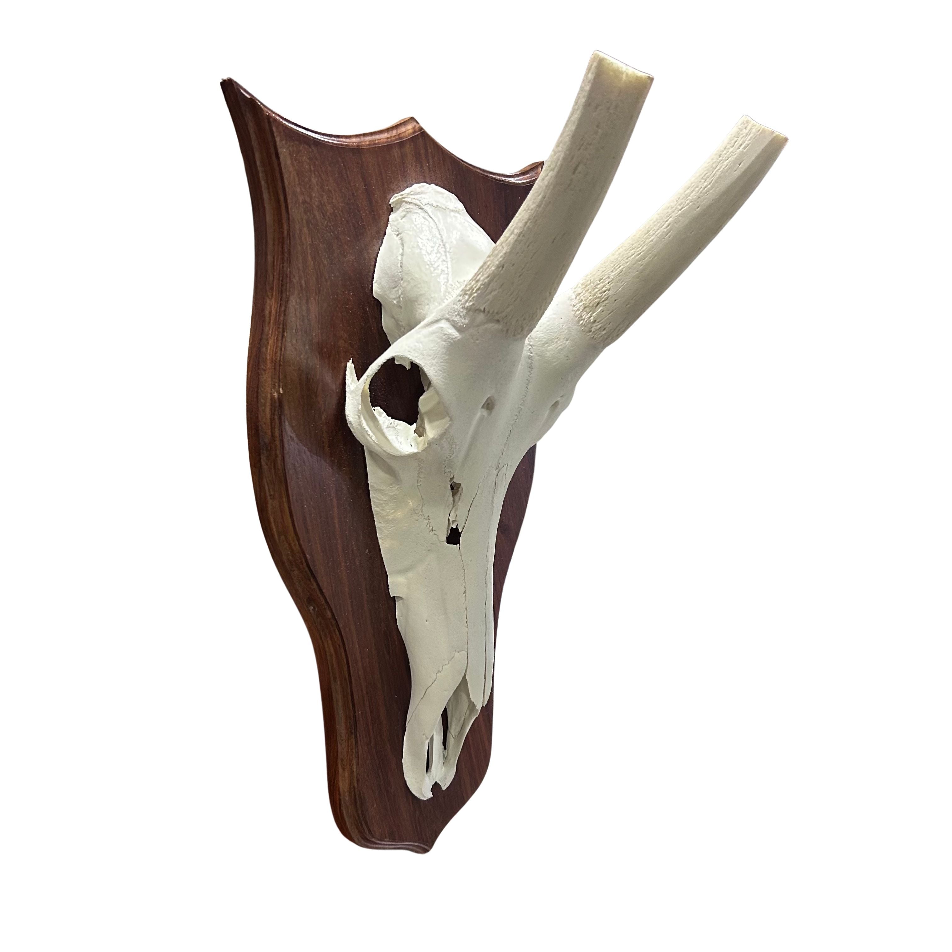 This beautiful African Waterbuck Skull has medium horns that stick forward.Full Mounted (skull and horns): 26X25X11"Add a unique touch to your home decor with this Real Waterbuck Skull. Measuring around 26”X25X11" inches, this nice skull will make a bold statement in any room. Perfect for adding a touch of natural and exotic. The detachable horns allow us to ship the product to you very safely. You can also store it easily occupying much less space. Assembly of the horns is very easy. Just slide the horns onto the bone stubs.The Waterbuck is a big size antelope found mainly in Eastern and Southern subsaharan Africa. It is abundant in countries such as South Africa, Zimbabwe, Namibia, Tanzania, Zambia and Mozambique. Males have horns and females do not.This skull has been completely cleaned following strict taxidermy standards, the horns have been removed from the base and hollowed out. We put a metal bracket on the back for allow our customers to easily hang the skull on the wall.